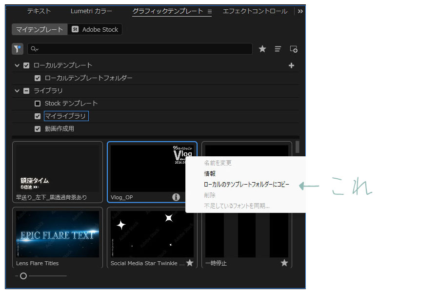 今回、祖母のVLOGの制作時、Adobe Premiere Proの「グラフィックテンプレート」に今後も毎回使用予定のOPENINGを登録しようと右クリックした時に気付いた。「ローカルテンプレートフォルダーにコピー」って、どこにコピー保存されちゃうんだろうと。