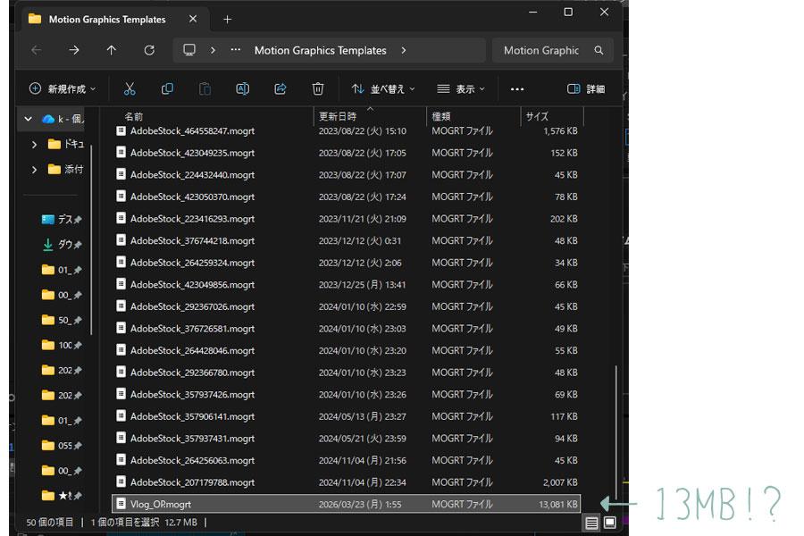 さっきローカルフォルダに保存してみた「Vlog_OP」が13MB。あんな単純な構造で短いテンプレが13MBってことは、じわじわとCドライブを圧迫してくるやつだ!しかも見つけにくいやつ。